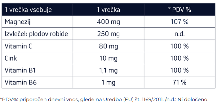 Prehransko dopolnilo ni nadomestilo za raznovrstno in uravnoteženo prehrano ter zdrav način življenja. Ni primerno za otroke.