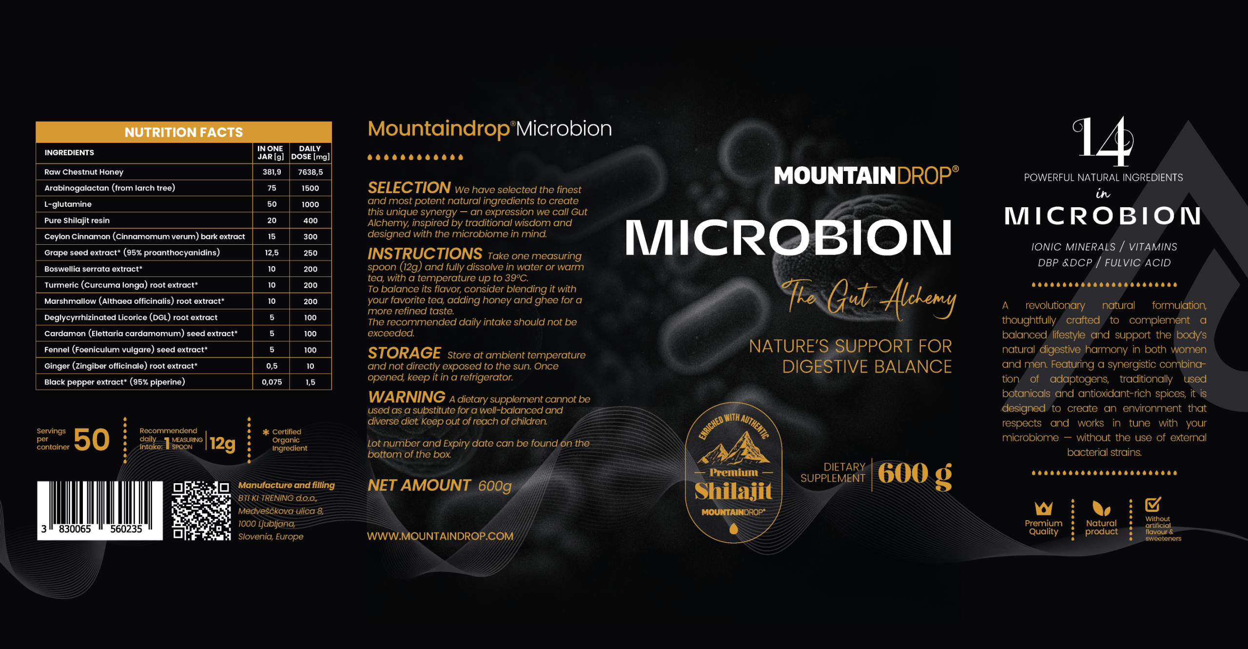 Mountaindrop® Microbion je celovit prašek za podporo črevesju, ki v enem dnevnem odmerku združuje 14 sestavin, podprtih z raziskavami. To ni probiotik ali izvleček posameznega zelišča – to je popolna formula za obnovo prebave, ki vsebuje vrhunski šilajit, zdravilne rastlinske snovi, prebiotike, aminokisline in pomirjujoče spojine, ki skupaj delujejo tako, da od temeljev obnovijo vaše črevesno okolje.